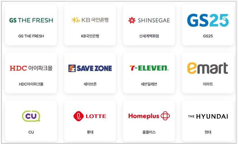 - 전자영수증 : 갤러리아 백화점, 롯데, 신세계백화점, 이마트, 현대, 홈플러스, GS, CU, 세븐일레븐, 한림대의료원